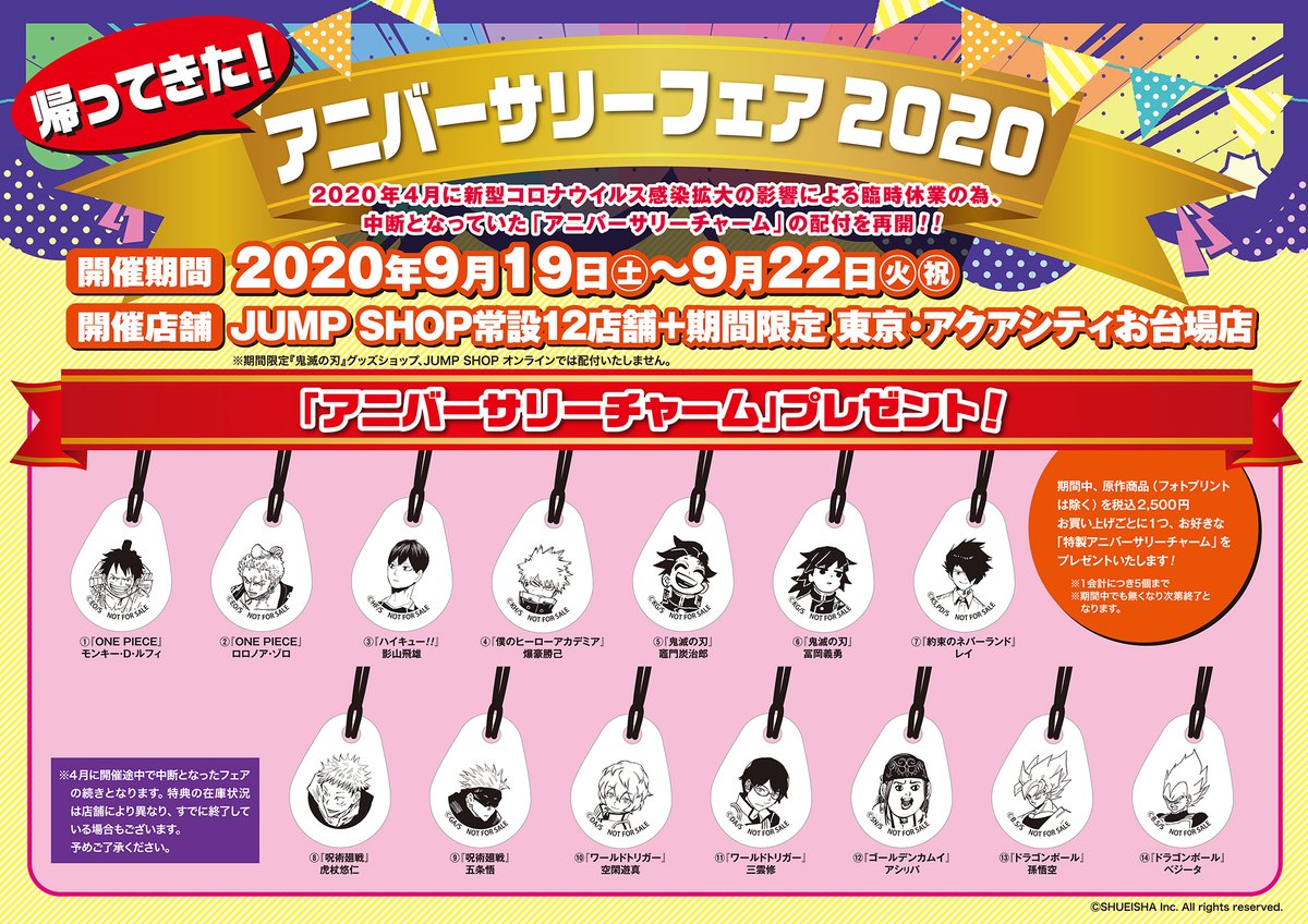 ジャンプショップ Jump Shop 公式 帰って来た アニバーサリーフェア 現在 Jump Shopでは原作商品を税込2 500円お買い上げごとに1つお好きなアニバーサリーチャームをプレゼント中 1会計につき5個まで 開催期間は 9 22 火祝 まで 店舗