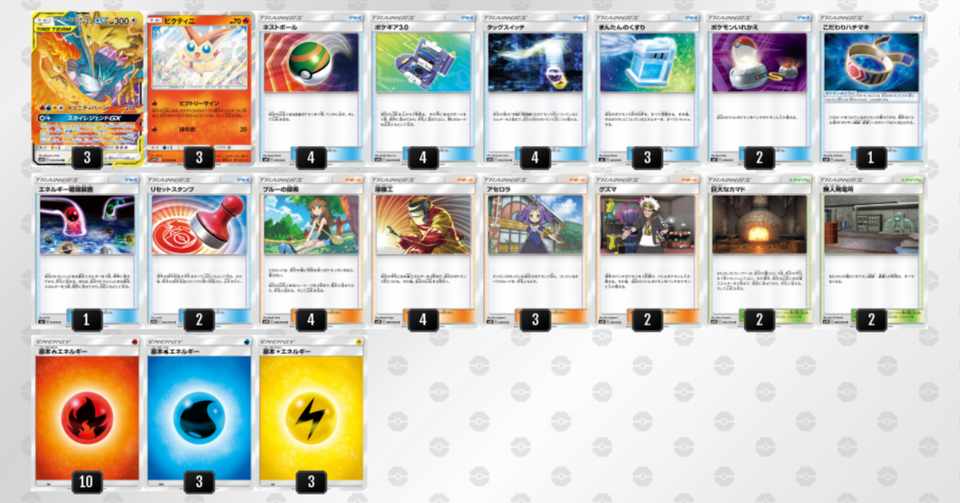 ビクティニ|ポケモンカードゲーム公式ホームページより引用 コイントスのワザを使うデッキではお馴染みのポケモンですね。 ビクティニが何枚いても特性「しょうりのほし」は自分の番に1回しか使えませんが、サイド落ちスタートでは非常に辛いので2枚. 自分のサイド枚数によって 「ダイキリ」 でダメージを出せるのももちろんですが、 「みねうち」 で一気に相手の残りhpを「10」にすることを狙っていきます。. 今回は2/9のシティリーグ福岡で優勝をした エースバーンvmax のデッキレシピと、優勝デッキを分析した感想をご紹介をしようと思います。 ポケモンカードのデッキを構築する時の参考になるような記事になっています。.