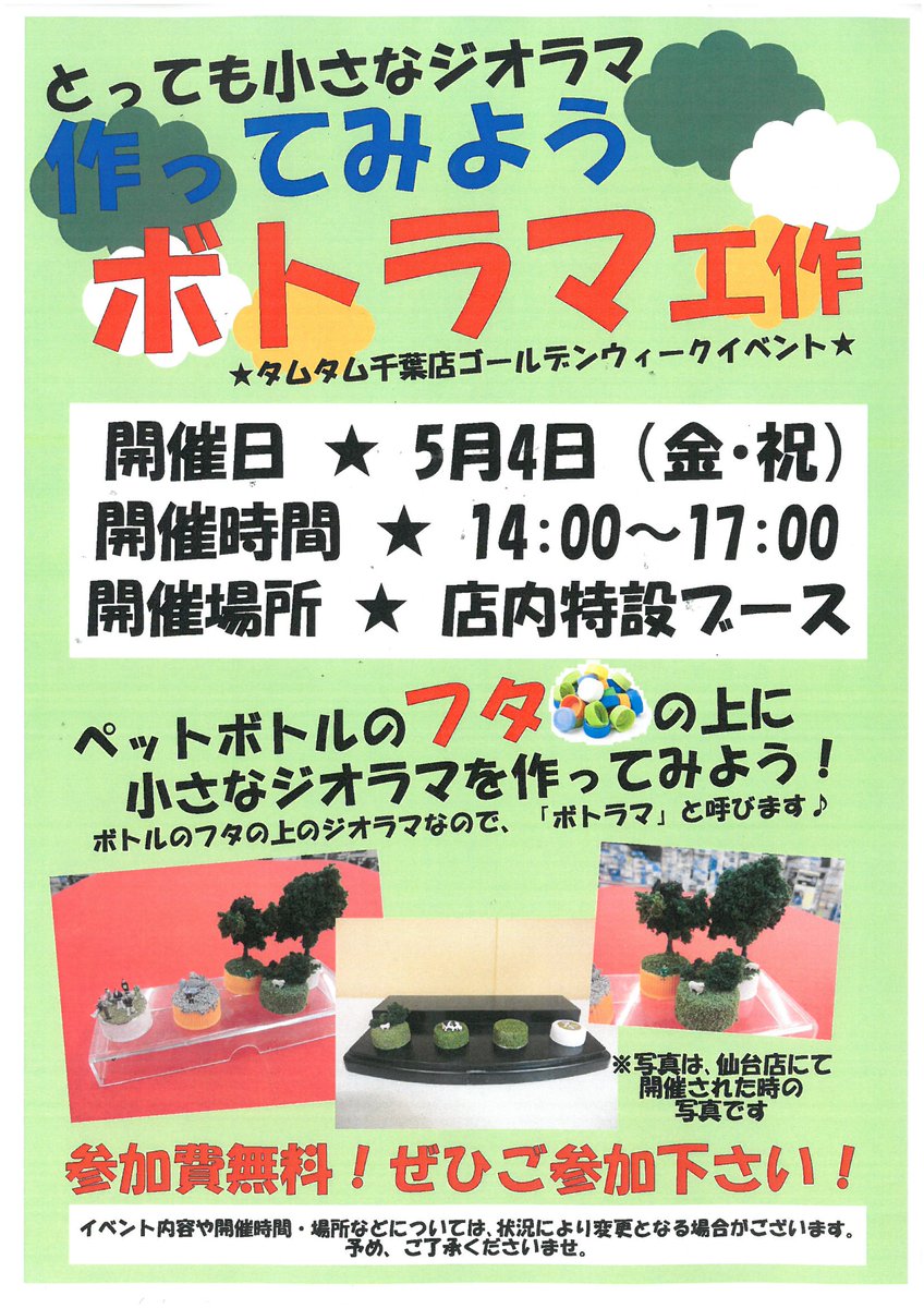 Tamtam千葉店 ゴールデンウィークイベント 5月4日はこちらのイベント開催致します ボトルのふたに作るジオラマ 略して ボトラマ の工作イベントです 可愛いジオラマ作成にチャレンジしてみませんか 是非こちらのイベントご参加くださいませ