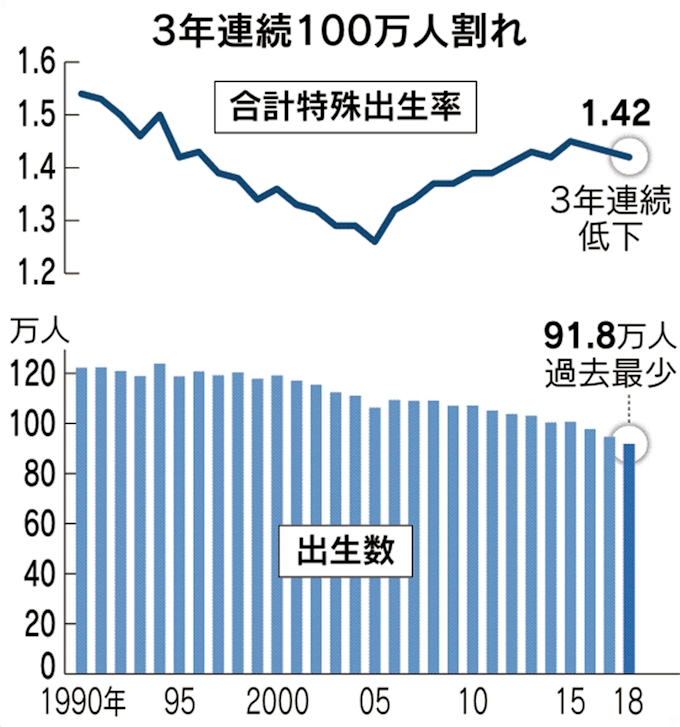 18年の出生数91 8万人 最低を更新 出生率は1 42 日本経済新聞