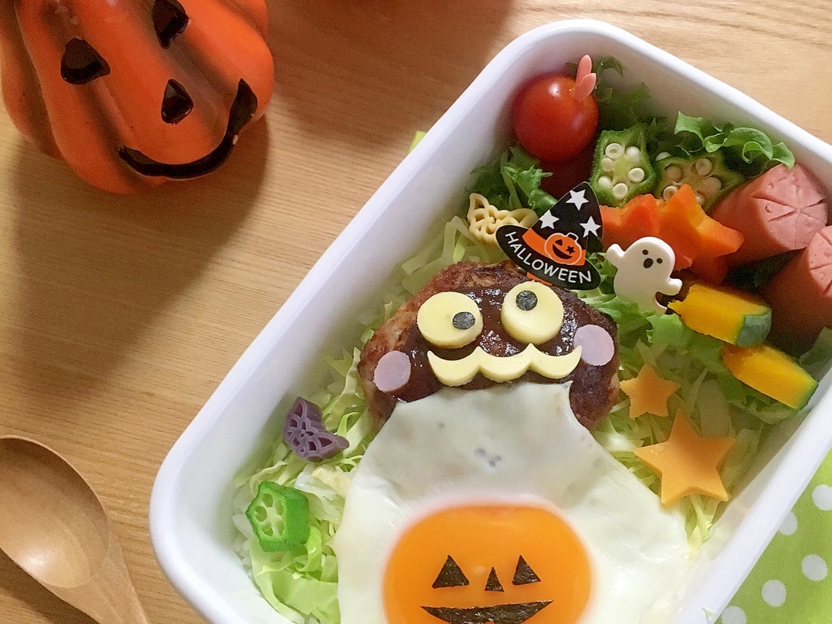 ミイラ男ハンバーグとくまちゃんのハロウィン弁当 バスのキャラ弁 Cafeごはん ときどきおやつ
