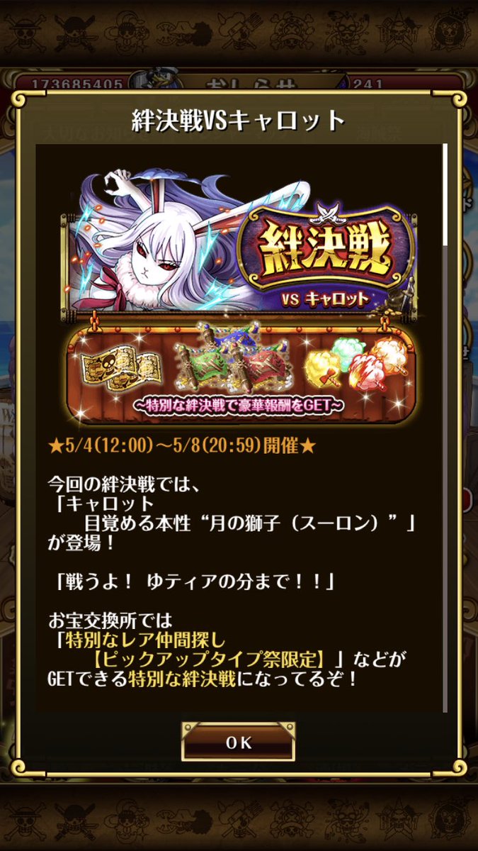 One Piece トレジャークルーズ 開催終了まであと2日 現在開催中の絆決戦 Vsキャロット は5 8 59まで 今回のお宝交換所では新たに下記の豪華報酬が追加されているので 見逃せないぞ 特別なレア仲間探し ピックアップタイプ祭限定
