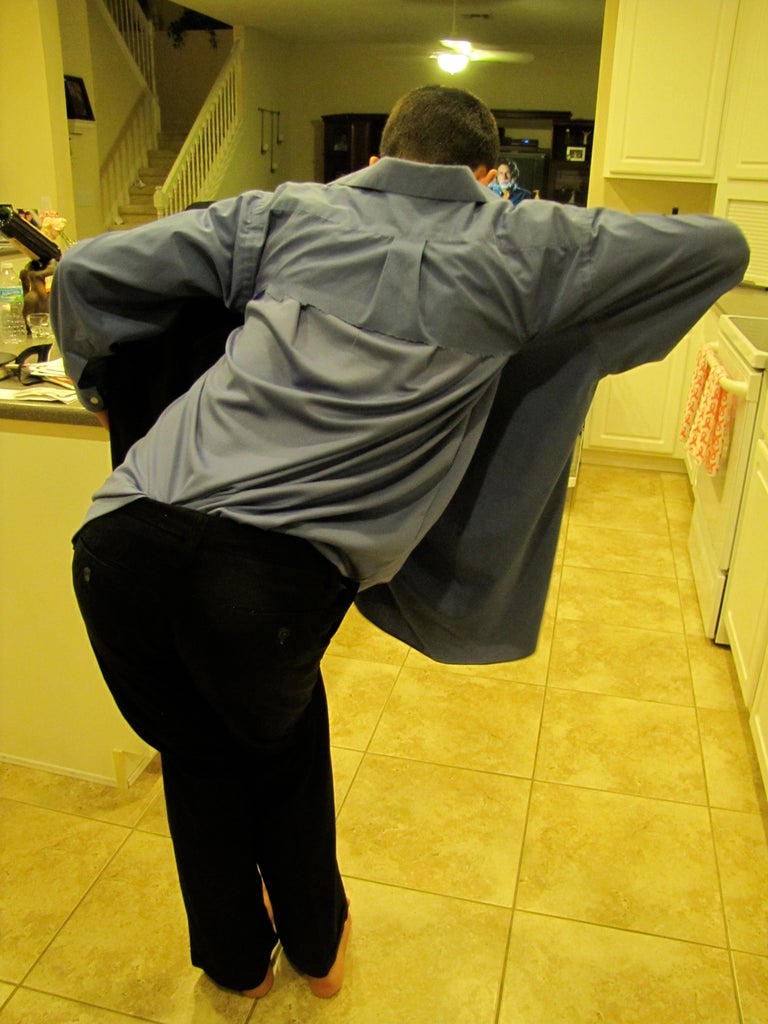 Anyway, it really looks like this guy knows what he's doing. We slit a hole by the calves so he can slip his legs in. This is a great Halloween costume and is a good trick to play on friends and family and it is simple to make.