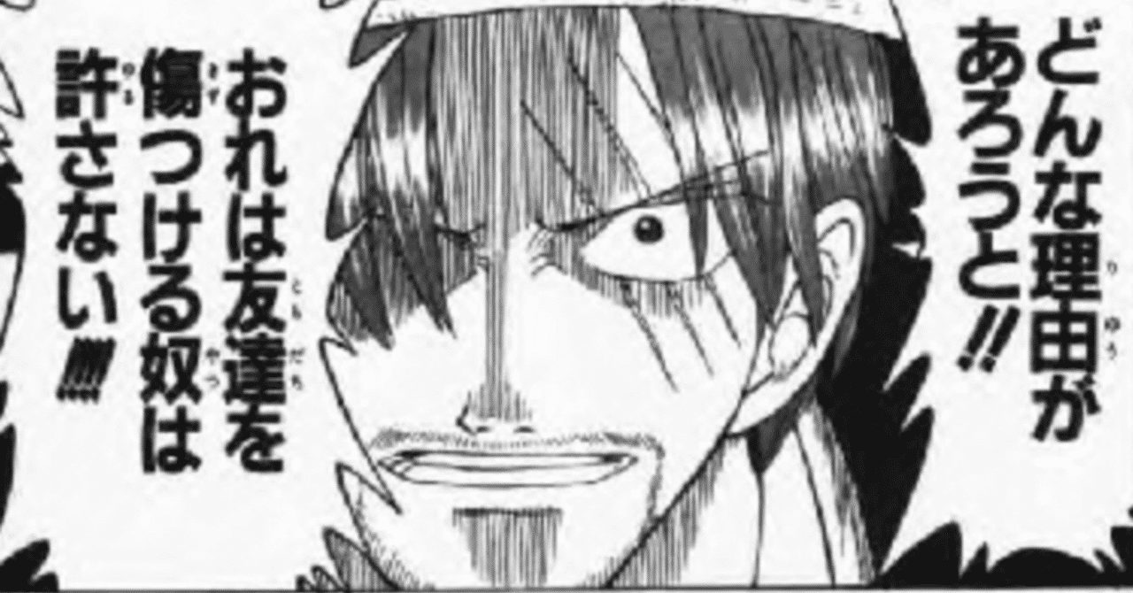 いいか山賊 おれは酒や食い物を頭からぶっかけられようが つばを吐きかけられようが たいていの事は笑って見過ごしてやる だがな どんな理由があろうと おれは友達を傷つける奴は許さない ワンピース