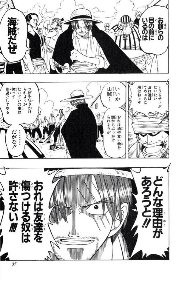 Onepiece Drama 第1巻の好きなシーン ヘラヘラしていたシャンクスが男を見せたセリフ この男気持ちたいですね どんな理由があろうと おれは友達を傷つける奴は許さない Http T Co 015uopntx4