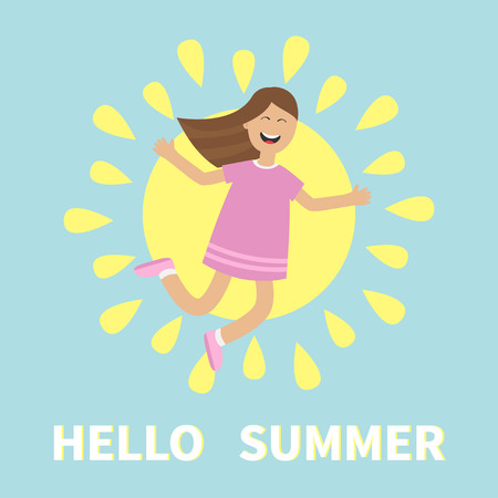 孤立したジャンプの女の子 太陽輝くアイコン 夏の時間 幸せな子供のジャンプ 紫のドレスで文字を笑ってかわいい漫画 笑顔の女性 白い背景 フラット デザイン ベクトル イラストのイラスト素材 ベクタ Image