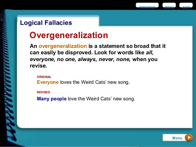 For example, because porous → porosity and generous → generosity, hackers happily generalize:. For example, if you once gave a poor speech, you may think to yourself, "I always screw up speeches. Overgeneralization is a fallacy occurring when a statistic about a particular population is asserted to hold among members of a group for which the original population is not a representative sample.
